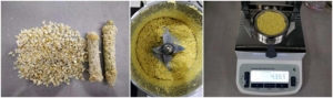- 將玉米一粒粒掰開,放入攪拌機(jī)中進(jìn)行攪拌,充分?jǐn)嚢璩捎衩酌婧?,用?shí)驗(yàn)勺取365g玉米面均勻鋪在樣品盤上,設(shè)置好合適的溫度后蓋下上蓋,按下“START”鍵開始測試;蜂鳴兩聲后,儀器自動停機(jī),測試結(jié)束,可在液晶顯示屏查看測試后玉米面的水含量為47.02%;