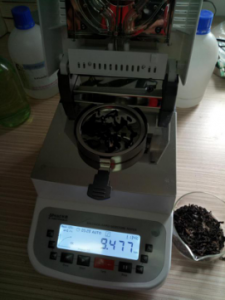 - 測試茶葉片:為了使測試過程中茶葉水分儀將茶葉烘干烘透,我們將茶葉攤成分散狀,以便溫度能滲透進(jìn)去。取2克茶葉片絲置于不銹鋼托盤中,用鑷子將茶葉片絲平鋪均勻,為避免茶葉烘烤后變焦,我們將溫度設(shè)置在135℃,按“START”鍵開始測試,5分28秒后檢測結(jié)束,檢測數(shù)據(jù)顯示9.477%;