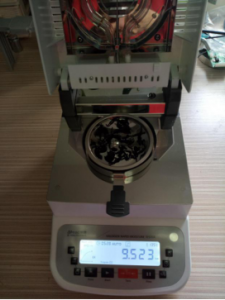 - 為了得到更精確穩(wěn)定的數(shù)據(jù)結(jié)果,在進(jìn)行第二次測試過程前先等待茶葉水分儀降溫,待儀器本身溫度降至40度以下時(shí),同樣取2克茶葉片絲于不銹鋼托盤中,將茶葉片絲平鋪均勻,這次我們把溫度設(shè)定在135℃,按“START”鍵開始測試,5分28秒后檢測結(jié)束,檢測數(shù)據(jù)顯示9.523%;